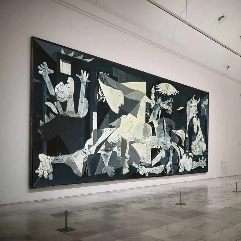 Bức tranh này là một tác phẩm chống chiến tranh của Pablo Picasso, được vẽ vào năm 1937 để phản đối cuộc ném bom Guernica của quân Phát xít Đức trong cuộc Nội chiến Tây Ban Nha. Bức tranh khổng lồ này (3,5 x 7,8 mét) thể hiện sự khủng khiếp và đau khổ của người dân Guernica khi bị tấn công bằng bom. Bức tranh được chia thành nhiều phần nhỏ, mỗi phần cho thấy một hình ảnh bi thương: một người phụ nữ kêu gào vì con bị chết, một người đàn ông chết trong lửa, một con ngựa chết vì bị xuyên tim, một con bò chết vì bị nổ tung... Bức tranh dùng các hình dạng đơn giản và các màu sắc trắng đen để tạo ra một hiệu ứng mạnh mẽ và ám ảnh. Bức tranh là một ví dụ điển hình của phong cách tranh trừu tượng lập thể, khi họa sĩ dùng các hình khối để biến dạng và tái cấu trúc lại hình ảnh thực tế.