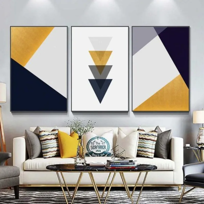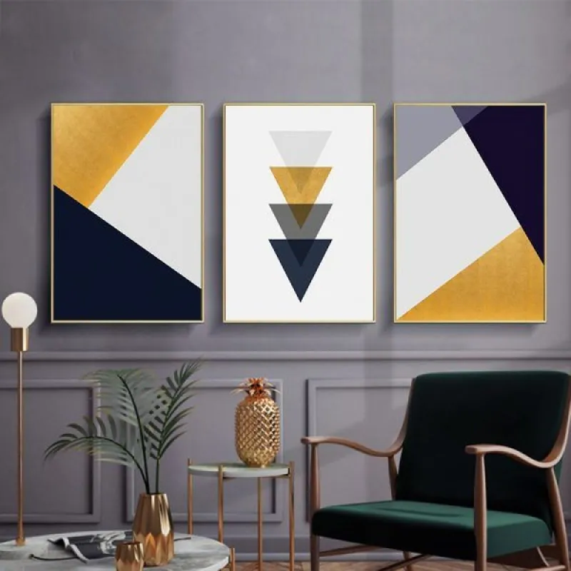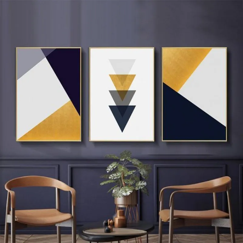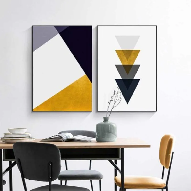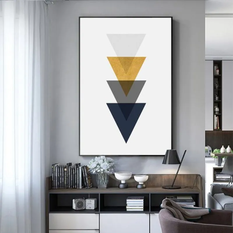Tranh in canvas trừu tượng hình học với những hình tam giác xếp chồng lên phần đỉnh của nhau theo chiều hướng. Thích hợp treo ở phòng khách, phòng làm việc, phòng ngủ, quán cà phê, chân cầu thang, bàn học, bàn làm việc…