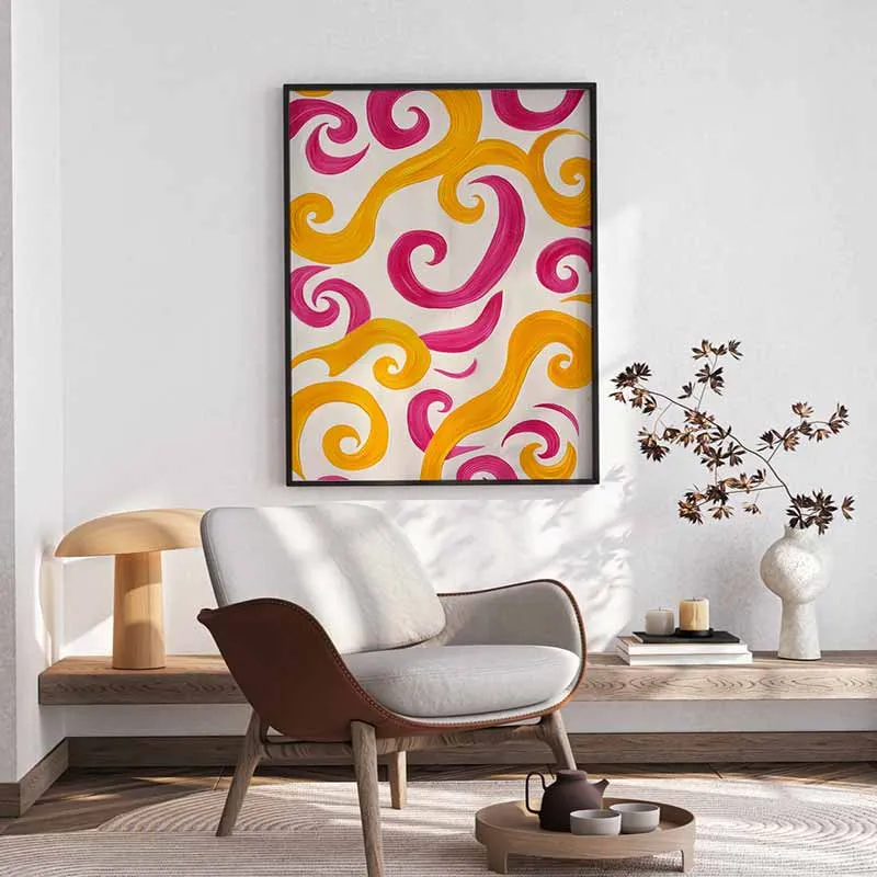 - Không gian làm việc/Studio: Những đường xoắn ốc và đường cong mềm mại tượng trưng cho sự linh hoạt, dòng chảy ý tưởng và không ngừng phát triển. Cùng với sắc hồng và vàng tươi sáng, chúng có thể kích thích sự sáng tạo và mang lại tinh thần lạc quan. Treo bức tranh trong văn phòng làm việc tại nhà hoặc studio nghệ thuật để tạo nguồn cảm hứng.