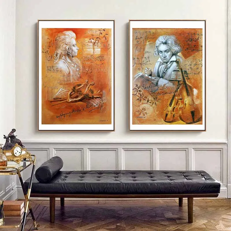 Tranh chân dung nhạc sĩ Mozart với kèn Trumpet và nhạc sĩ Beethoven với cây đàn vĩ cầm Violin - Xem giá
