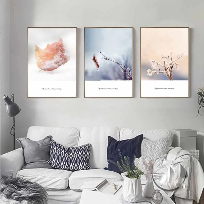 Ba bức tranh treo tường với chủ đề mùa đông, gồm lá phong vàng phủ tuyết, cành khô có giọt nước đóng băng và cành cây nhỏ phủ đầy sương giá. Tone màu nhẹ nhàng, mang vẻ đẹp thanh bình của thiên nhiên.