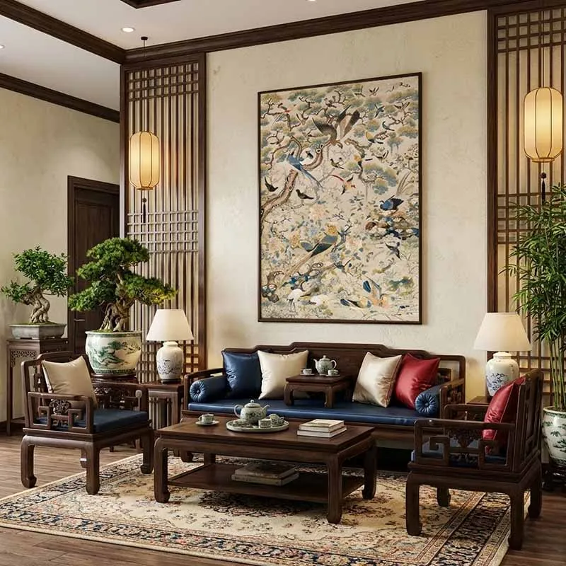 Đối với Phòng khách: Đây là không gian sinh hoạt chung và đón tiếp khách, cần sự sang trọng và ấn tượng. Bức tranh "Bách Điểu Quần Tụ" với kích thước lớn và chi tiết tỉ mỉ sẽ đóng vai trò là một điểm nhấn (focal point) tuyệt vời. Nó không chỉ làm sáng bừng không gian mà còn mang ý nghĩa phong thủy tốt lành (đất lành chim đậu, sự phồn vinh), tạo cảm giác thư thái nhưng vẫn đẳng cấp cho gia chủ.