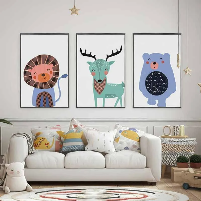 Bộ tranh gồm ba bức vẽ theo phong cách hoạt hình đáng yêu, khắc họa hình ảnh một chú sư tử với bờm nâu cam, một chú hươu xanh ngọc với chiếc khăn quàng đỏ họa tiết và một chú gấu xanh dương mũm mĩm. Mỗi nhân vật đều có biểu cảm tươi vui, phù hợp để trang trí không gian phòng trẻ em, mang đến sự sinh động và ấm áp.