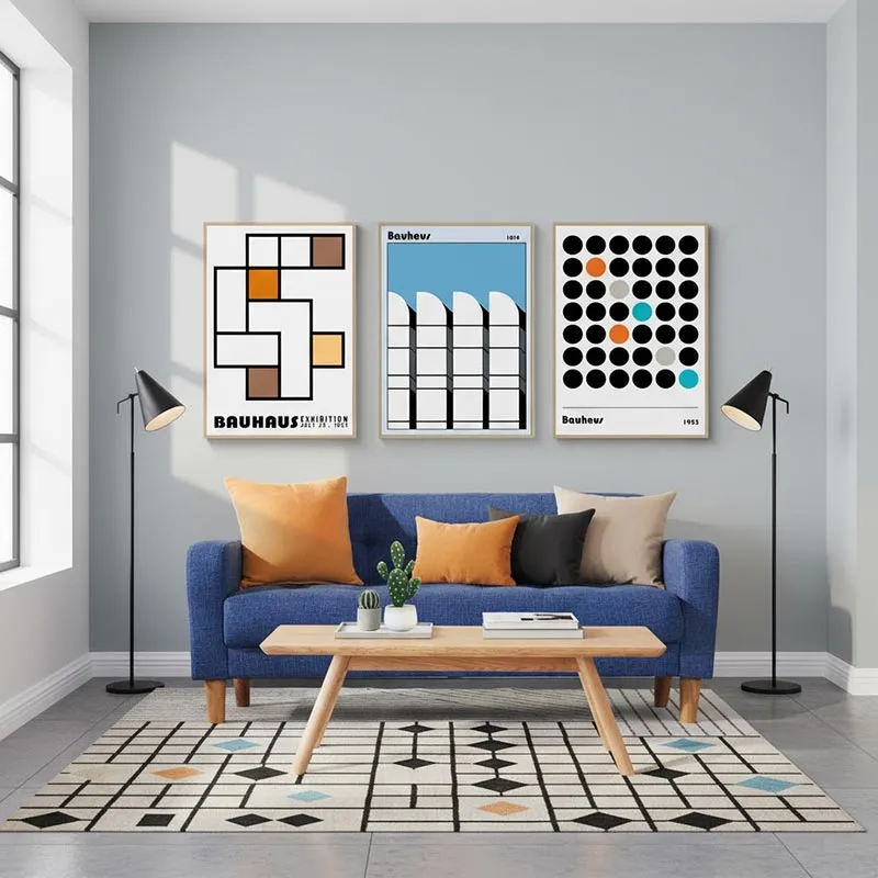 Phòng khách: Bộ tranh mang tính đối xứng và đồng nhất cao, tạo điểm nhấn cân bằng và hài hòa trên tường phía trên sofa. Phong cách Bauhaus không bao giờ lỗi thời, dễ dàng kết hợp với đồ nội thất Mid-Century Modern hoặc Scandinavian.