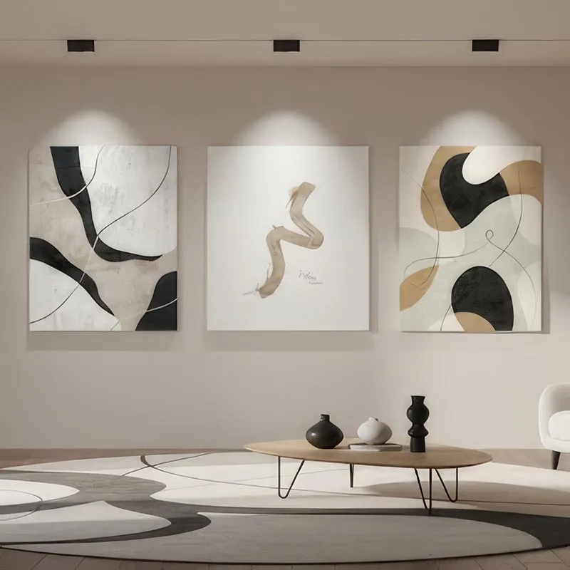 Đây là một bộ ba tranh trừu tượng hiện đại, sử dụng các đường cong uốn lượn (swirls), hình khối hữu cơ và các mảng màu tinh tế. Bảng màu chủ đạo là các tông trung tính như đen than, be, trắng ngà và nâu đất nhạt (taupe). Bố cục của ba bức tranh có sự tương đồng về phong cách nhưng khác biệt về chi tiết, tạo ra một tổng thể hài hòa và có sự liên kết. Ánh sáng mạnh từ đèn spotlight làm nổi bật kết cấu và độ bóng của tranh.