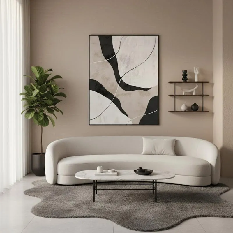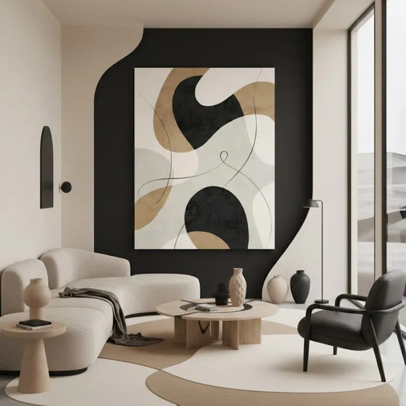 Phòng khách: Màu sắc trung tính và thiết kế tối giản của bộ tranh hòa hợp hoàn hảo với phong cách nội thất hiện đại, Zen hoặc tối giản. Chúng tạo ra một không gian thư thái, thanh lịch và mang tính nghệ thuật cao, đồng thời giúp "neo" không gian.