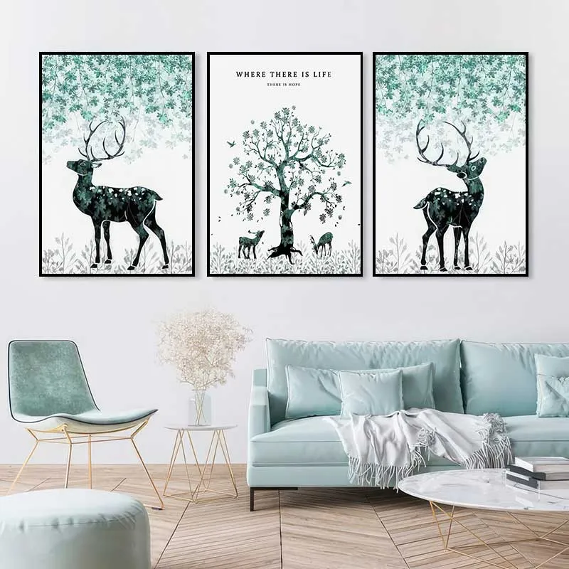 Bộ tranh "Thiên Nhiên Bình Yên" mang đến một không gian nghệ thuật thanh bình và tinh tế với ba bức tranh nhỏ kết hợp giữa hình ảnh động vật, thiên nhiên và chữ viết. Mỗi bức tranh đều thể hiện vẻ đẹp của rừng xanh, cây cối và những chú hươu trong phong cách minh họa đơn giản nhưng đầy sức sống. Trung tâm là một bức tranh với dòng chữ "WHERE THERE IS LIFE, THERE IS HOPE," tạo nên thông điệp tích cực về sự sống và hy vọng.