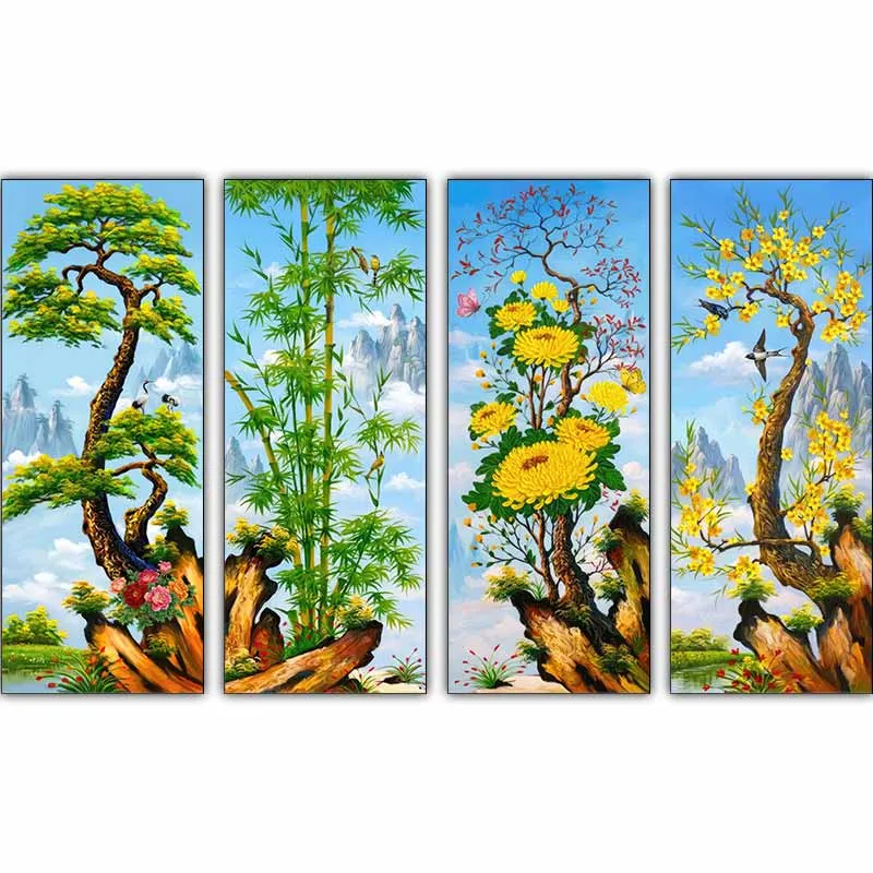 Bộ tranh in canvas Tứ Quý là sự tái hiện sinh động hình ảnh bốn loại cây tiêu biểu: Tùng, Trúc, Cúc, Mai, đại diện cho bốn mùa Xuân - Hạ - Thu - Đông. Nổi bật với gam màu rực rỡ, tươi sáng trên nền trời xanh bao la và núi non trập trùng, kết hợp cùng các chi tiết chim muông (hạc, én, bướm) tinh tế, bộ tranh toát lên sức sống mãnh liệt. Dù là bản in canvas, tác phẩm vẫn giữ được độ sắc nét và cái hồn của nghệ thuật truyền thống, mang ý nghĩa cầu chúc sự may mắn, bình an, tài lộc và khí tiết thanh cao cho gia chủ.