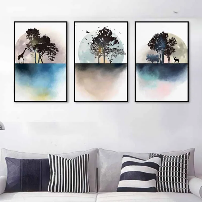 Bộ tranh hươu cao cổ đứng dưới tán cây và mặt trăng