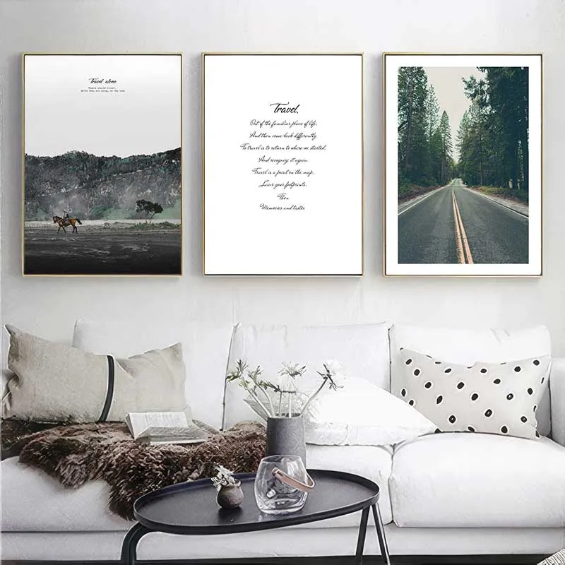 Bộ tranh này mang phong cách tối giản (minimalist) với ba bức tranh độc đáo, kết hợp giữa hình ảnh thiên nhiên và nghệ thuật chữ viết. Bức thứ nhất thể hiện cảnh một người cưỡi ngựa trên đồng bằng rộng lớn, tạo cảm giác hoang sơ và tự do. Bức thứ hai là một tác phẩm chữ viết nghệ thuật về chủ đề du lịch, truyền cảm hứng khám phá cuộc sống. Bức thứ ba là hình ảnh con đường trải dài qua khu rừng xanh mát, gợi lên khát vọng phiêu lưu và khám phá. Bộ tranh phù hợp để trang trí cho không gian phòng khách, văn phòng hoặc phòng ngủ, mang đến sự thanh lịch và tinh tế.
