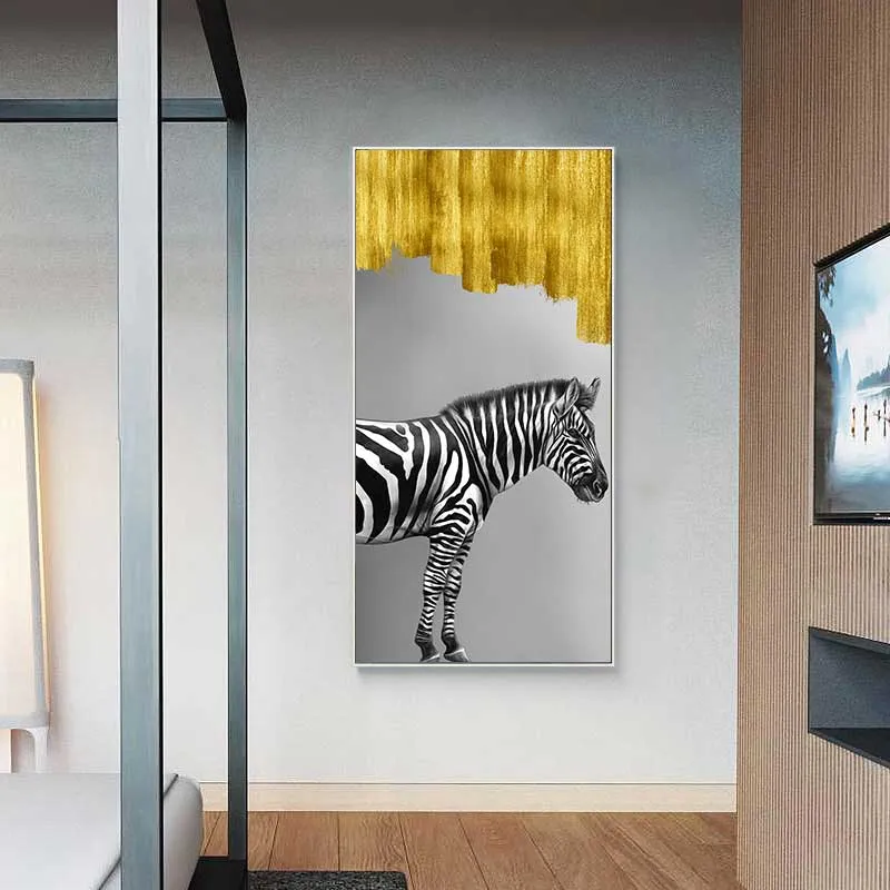 Bức tranh nghệ thuật này mang phong cách tối giản nhưng đầy ấn tượng, khắc họa hình ảnh một chú ngựa vằn (zebra) với họa tiết đen trắng nổi bật. Phần trên của bức tranh được nhấn nhá bằng đường nét vàng rực rỡ, tạo nên sự tương phản mạnh mẽ và thu hút. Tác phẩm sử dụng gam màu trung tính làm nền, giúp chú ngựa vằn trở thành tâm điểm của bức tranh. Bức tranh phù hợp để trang trí cho không gian phòng khách, văn phòng hoặc hành lang, mang đến vẻ đẹp tự nhiên kết hợp với sự hiện đại.