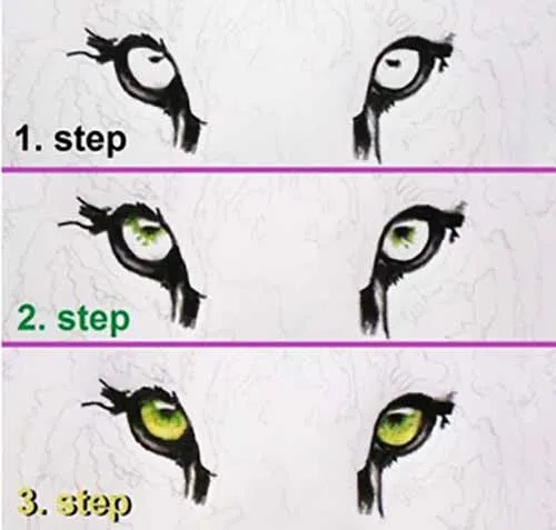 Cuối cùng, thêm màu vàng vào phần còn lại của mống mắt. Một số loài hổ có con mống mắt màu cam, vì vậy nếu bạn muốn, bạn có thể sử dụng màu này. Hãy cố gắng tạo ra sự chuyển động từ màu xanh đến màu vàng. Hãy cẩn thận phân tích hình ảnh tiếp theo của tôi và bạn sẽ nhận thấy không có ranh giới rõ ràng nào giữa màu xanh và màu vàng, vì tôi đã pha trộn hai màu này lại với nhau. Để nguyên vùng chưa được vẽ đến cho phản chiếu ánh sáng.