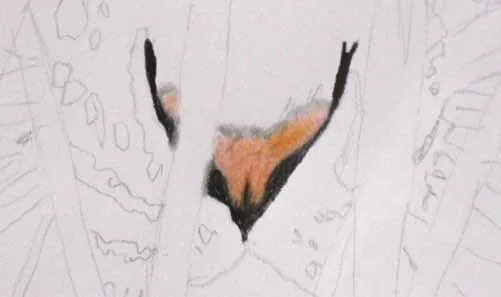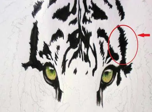 Sử dụng bút chì đen, tô đậm tất cả các mảng. Chúng không cần phải giống như các mảng trong ảnh mẫu. Vẽ lông đen ra từ các mảng, như bạn có thể thấy trong vòng tròn màu đỏ trong hình ảnh tiếp theo: