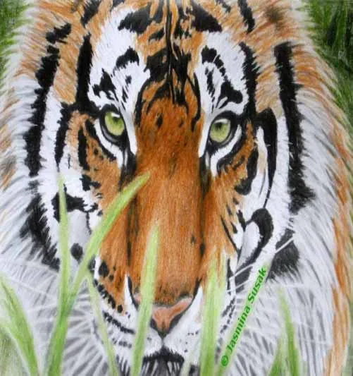 Bạn cũng có thể vẽ một số phần nền với bút chì màu xanh lá cây nhiều sắc thái hơn. Như bạn có thể thấy trong ảnh tham khảo, có cỏ phía trước con hổ, vì vậy hãy vẽ chúng bằng bút chì màu xanh lá cây nhạt và làm mờ cạnh.