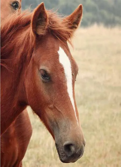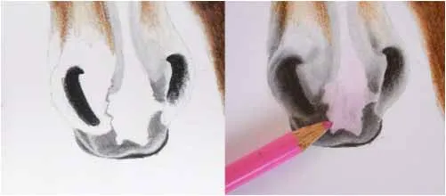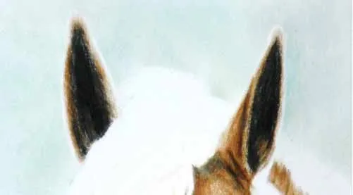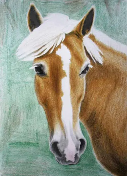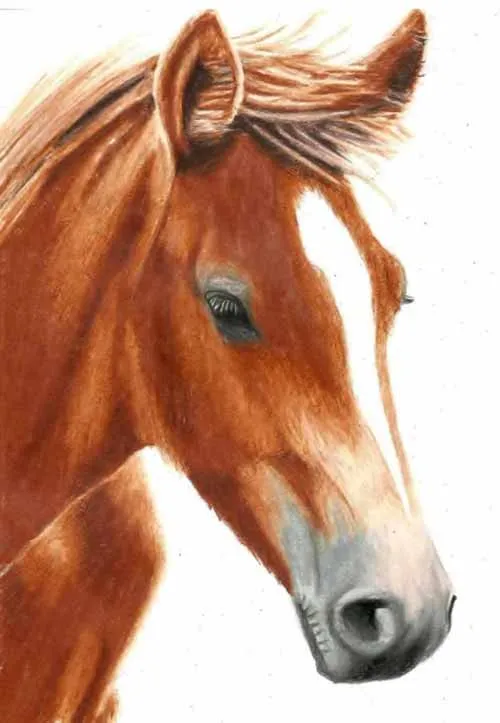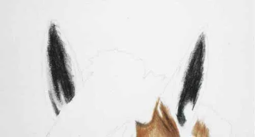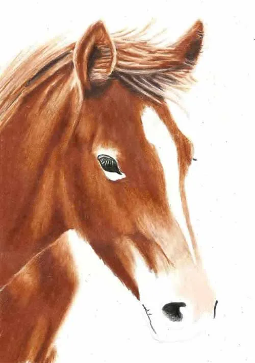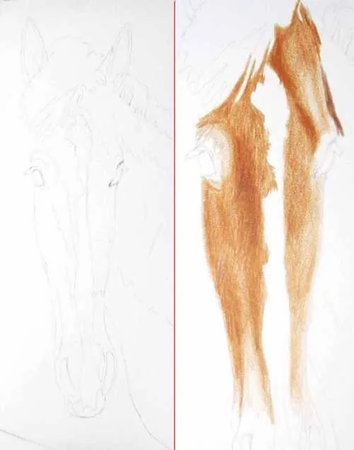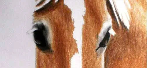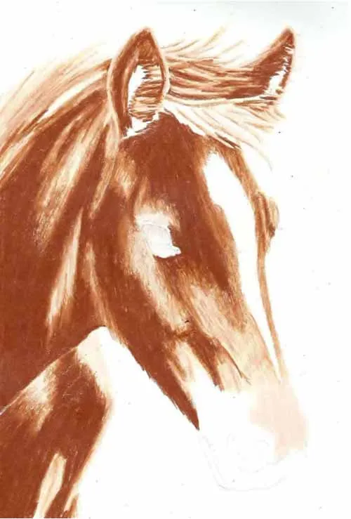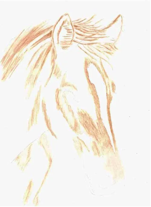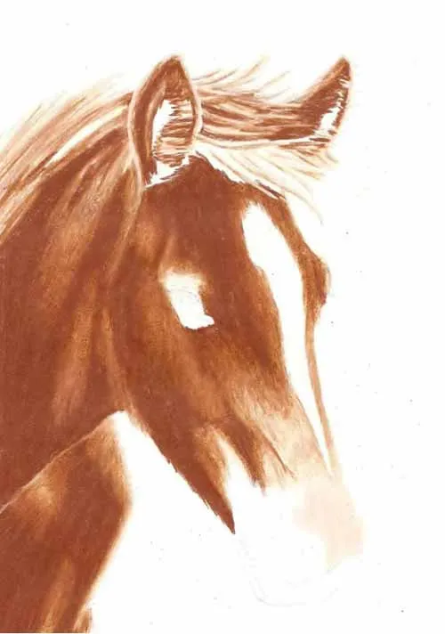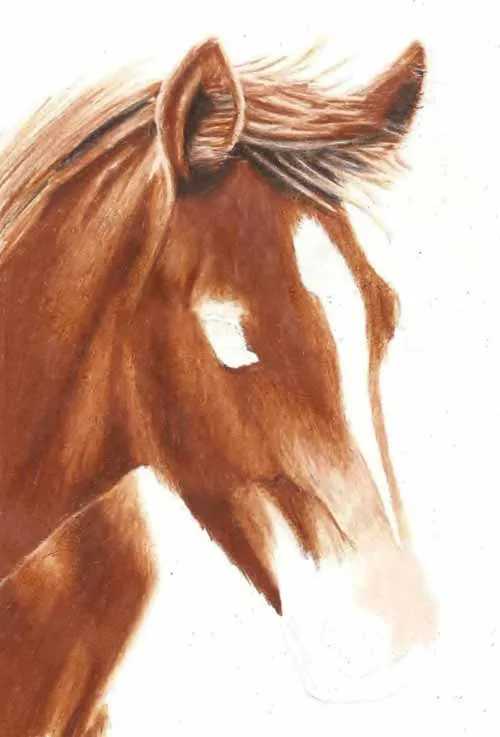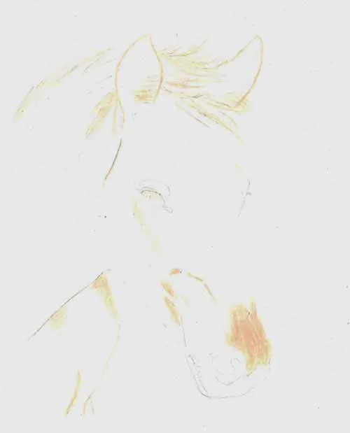 Vẽ các nét chính bằng bút chì than H. Sử dụng bút chì màu nâu nhạt, vẽ cẩn thận khắp phần đầu ngựa, để trống lông trắng ở giữa đầu và vị trí của mắt.