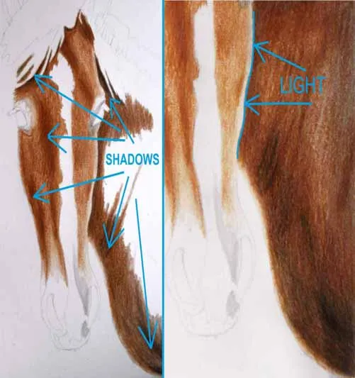 Sử dụng màu nâu đậm hơn, vẽ tất cả các phần của lông được che khuất bởi bóng. Sử dụng bút chì màu trắng đi qua các vùng màu nâu nằm ở rìa. Chúng được chiếu sáng nhiều hơn và phải nhạt hơn nhiều. Điều này là điều cần nhớ khi vẽ bất cứ thứ gì. Bạn có thể nhìn thấy trong hình ảnh tiếp theo đâu là bóng và đâu là điểm sáng và tô bóng chúng như thế nào. Hãy thử làm như vậy, đầu tiên nhẹ nhàng với bút chì nâu đậm và sau đó đè mạnh cho đến khi bạn đạt được sắc thái thích hợp.