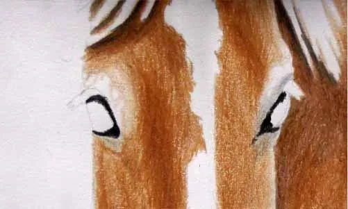 Sử dụng bút màu màu nâu đậm, vẽ phần còn lại của con ngựa, để lại lông trắng trên đầu. Các phần tối nhất và các điểm nhấn để lại cho các bước tiếp theo. Sử dụng bút sáp trắng, trộn các cạnh giữa các sắc thái với nhau.