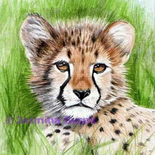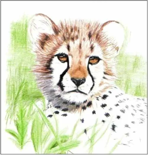Vẽ Báo cheetah rất đơn giản, chỉ có màu lông nâu và nhiều phần nên để trắng. Động vật này có bụng trắng, vì vậy chúng ta cần vẽ lông bằng vài gam màu của bút màu nâu chỉ ở phía sau và hai bên cơ thể và khuôn mặt. Bạn có thể sử dụng cùng một bút màu nâu, áp lực nặng và nhẹ trên bút để xây dựng lông. Như vậy, lông sẽ trông tự nhiên hơn nhiều. Luôn sử dụng nhiều gam màu khác nhau khi vẽ lông. Và khi vẽ lông trắng, hãy sử dụng bút màu xám để tạo bóng cho cổ nhé.