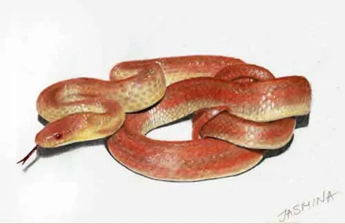 Dùng bút chì màu đỏ và cam để vẽ phần còn lại của thân rắn, nhẹ nhàng lan tỏa hai màu này lên nhau. Đè nhẹ khi vẽ các khu vực sáng bóng, như chúng ta đã đề cập trong các bước trước đó. Như các bạn nhỏ có thể thấy, cách này sẽ làm cho con rắn trông thực sự sống động.