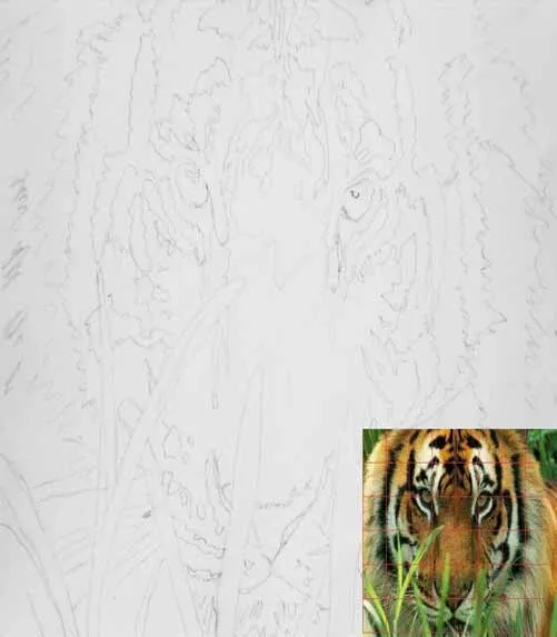 Trước tiên, bạn hãy vẽ một bản phác thảo và cố gắng làm cho nó đẹp và tỷ lệ chuẩn nhé. Hãy dành thời gian và kiên nhẫn để vẽ các đường chính, bởi vì đó là nền tảng của bức vẽ của bạn. Nếu bạn gặp khó khăn trong việc có được một phác thảo tỷ lệ, bạn có thể sử dụng phương pháp lưới, mà nhiều nghệ sĩ sử dụng. Thực ra, luôn luôn cố gắng vẽ các đường chính tự do và chỉ sử dụng lưới nếu các đối tượng trong phác thảo của bạn không trông đẹp và tỷ lệ. Một số nghệ sĩ tiên tiến chỉ sử dụng hai hoặc ba đường trong lưới của họ, vì điều này là đủ để định hướng. Nếu bạn sử dụng phương pháp lưới, việc phác thảo của bạn có thể diễn ra nhanh hơn nhiều, chưa kể là có ít việc tẩy xóa hơn và giấy vẫn được sạch sẽ. Trong hình ảnh tiếp theo, bạn có thể xem cách nó hoạt động, tôi đã tạo một mẫu cho bức vẽ của mình. Hãy kẻ các ô lưới bằng bút chì, sử dụng thước trên một bức ảnh tham khảo và vẽ lưới trên giấy trắng. Vẽ các đường chính của các ô của bức ảnh tham khảo vào các ô của giấy của bạn. Khi bạn hoàn thành phác thảo, hãy xóa các đường lưới nhé.
