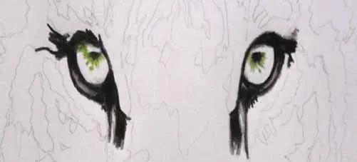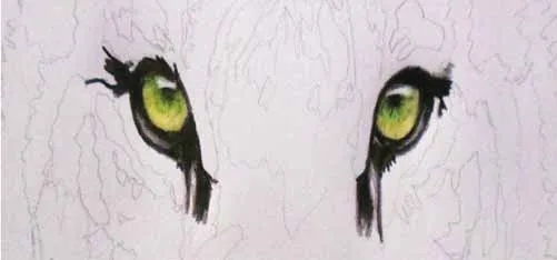 Cho phần còn lại của mắt, ta dùng bút chì màu nâu đen nhé! Với bút chì màu xám đậm, ta vẽ các khu vực xung quanh mắt. Lông mi thì giữ nguyên màu trắng, không sao cả, vì chúng bị ảnh hưởng bởi ánh sáng đó!