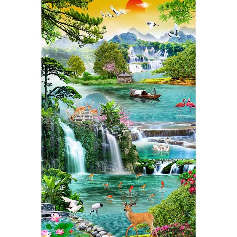 Bức tranh in canvas dọc mô tả một cảnh quan phong thủy hùng vĩ và thần tiên, nơi núi non điệp trùng giao hòa cùng sông nước trong xanh và nhiều thác nước nhiều tầng đổ xuống. Bầu trời hoàng hôn rực rỡ với đàn hạc bay, trong khi mặt hồ đầy sự sống với cá chép vàng bơi lội, thiên nga và hồng hạc. Cảnh vật được tô điểm bởi hươu, tùng, sen và một ngôi nhà nhỏ, tổng thể tạo nên một bức tranh "thập toàn đại mỹ" về sự thịnh vượng, sức khỏe và hạnh phúc viên mãn..