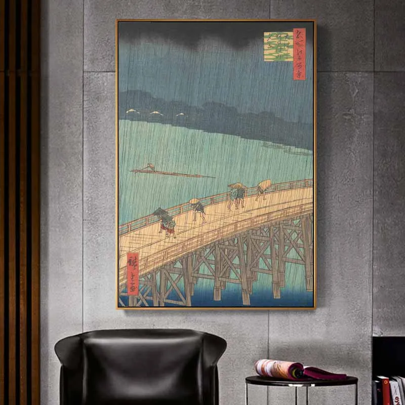 Bức tranh tái hiện kiệt tác khắc gỗ Ukiyo-e "Sudden Shower over Shin-Ōhashi Bridge and Atake" của danh họa Nhật Bản Utagawa Hiroshige. Bức tranh nắm bắt khoảnh khắc kịch tính của một trận mưa rào bất ngờ đổ xuống cây cầu Shin-Ōhashi và dòng sông Sumida, với những người đi đường vội vã trú mưa và những chiếc thuyền lênh đênh. Tông màu xanh xám chủ đạo kết hợp với những nét vẽ tinh xảo tạo nên một khung cảnh đầy kịch tính nhưng cũng rất thơ mộng.