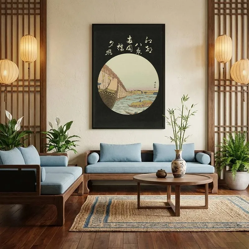 Bức tranh canvas này tái hiện một trong những tác phẩm nổi tiếng của họa sĩ Torii Kiyonaga thuộc trường phái Ukiyo-e. Tác phẩm khắc họa khung cảnh nhộn nhịp nhưng đầy chất thơ của cây cầu Ryogoku bắc qua sông Sumida tại Edo (Tokyo ngày nay). Điểm độc đáo nằm ở bố cục hình tròn (như một khung cửa sổ hoặc chiếc quạt) nổi bật trên nền đen tuyền, kết hợp với những dòng thư pháp Nhật Bản mềm mại, tạo nên vẻ đẹp vừa cổ điển, vừa huyền bí.