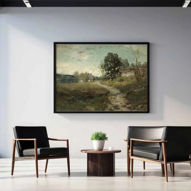 Bức tranh phong cảnh này khắc họa một con đường đất quanh co dẫn về một ngôi nhà tranh nhỏ ẩn mình giữa thiên nhiên xanh tươi. Với nét vẽ cổ điển, màu sắc dịu nhẹ, tự nhiên và bố cục mở rộng, tác phẩm mang lại cảm giác bình yên, hoài niệm và sự thư thái, gợi lên hình ảnh một buổi chiều êm ả ở vùng nông thôn, như một không gian thoát ly khỏi cuộc sống ồn ào.