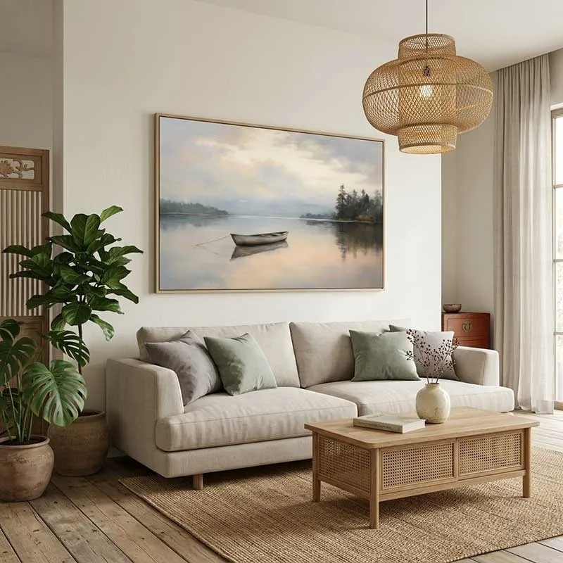 Bức tranh này đặc biệt phù hợp với Không gian tối giản (Minimalist). Sự đơn giản của chiếc thuyền đơn độc trên mặt nước rộng lớn và bảng màu trung tính ấm áp làm cho nó trở thành một điểm nhấn tinh tế mà không làm lộn xộn không gian, tạo ra một bầu không khí thiền định. Nó cũng có thể bổ sung cho một không gian Cổ điển nhẹ nhàng nhờ chủ đề phong cảnh truyền thống.