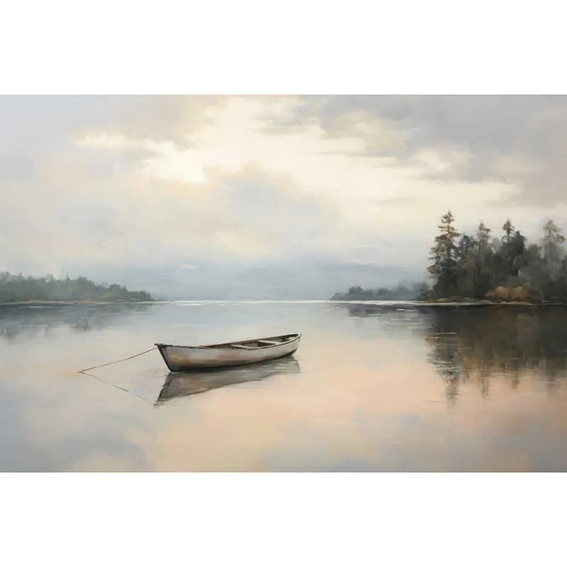 Bức tranh in canvas này khắc họa một khung cảnh tuyệt vời về sự yên bình và tĩnh lặng: một chiếc thuyền gỗ nhỏ neo đơn, có mái chèo, trôi tự do trên mặt nước phẳng lặng như gương. Phía xa, những hòn đảo mờ sương với rừng cây lá kim được tắm trong ánh sáng ấm áp, dịu nhẹ của bình minh hoặc hoàng hôn. Bầu trời nhiều mây với tông màu hồng và vàng nhạt tạo nên một bầu không khí thiền định và sâu lắng, mời gọi người xem tìm thấy sự bình an trong tâm hồn. Mọi chi tiết đều được tái hiện một cách mượt mà và tinh tế trên chất liệu canvas chất lượng cao, mang đến cảm giác hoài cổ và thanh thản.