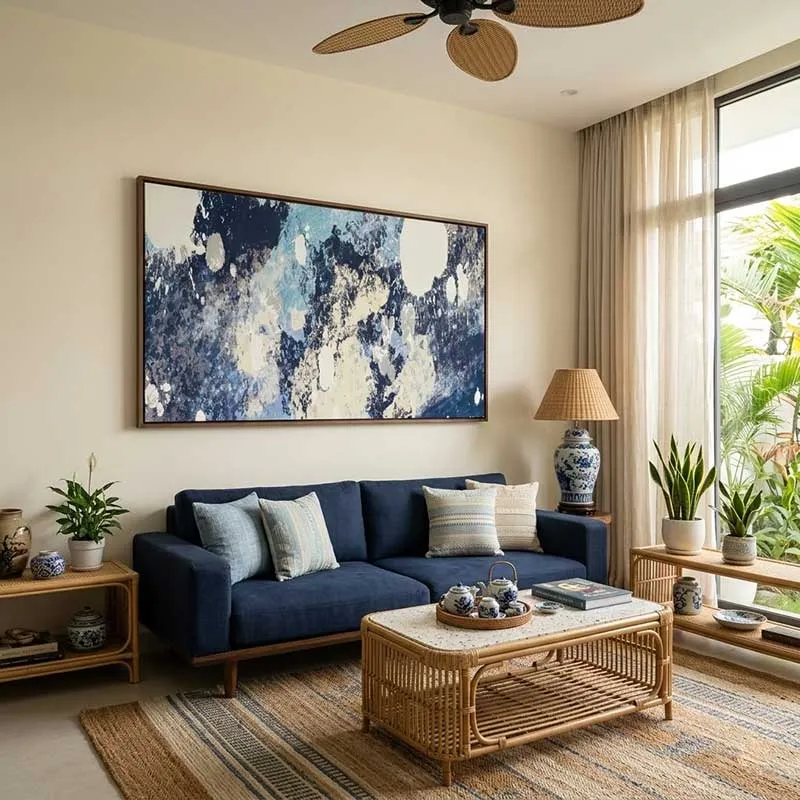 Lý do: Nghệ thuật trừu tượng kích thước lớn luôn là một "tuyên ngôn" tuyệt vời cho phòng khách. Những vệt màu văng tung tóe đầy năng lượng sẽ trở thành tâm điểm thu hút ánh nhìn, gợi mở những cuộc trò chuyện thú vị khi có khách ghé thăm. Tone màu xanh dương cũng mang lại cảm giác thư giãn, bình yên nhưng không kém phần sang trọng cho không gian sinh hoạt chung.