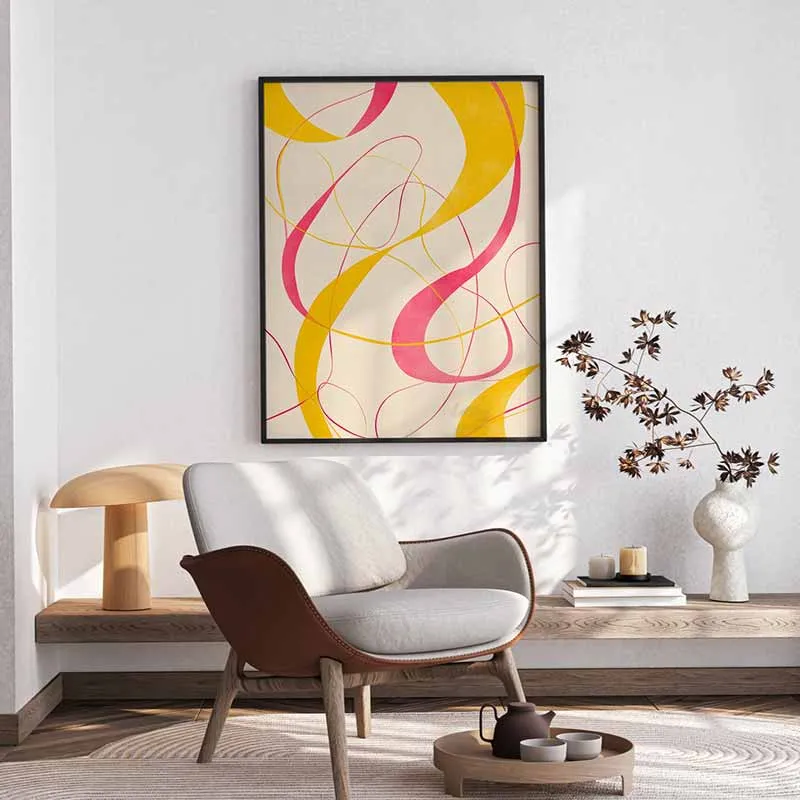 - Không gian làm việc/Studio: Những đường nét uốn lượn tượng trưng cho sự linh hoạt và dòng chảy ý tưởng, cùng với sắc hồng và vàng tươi sáng, có thể kích thích sự sáng tạo và mang lại tinh thần lạc quan. Treo bức tranh trong văn phòng làm việc tại nhà hoặc studio nghệ thuật để tạo nguồn cảm hứng.