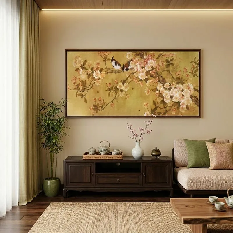 Giải thích lý do phù hợp nhất với Phòng khách: Trong văn hóa Á Đông, hoa đào/hoa mai nở rộ cùng những chú chim hót líu lo là biểu tượng của mùa xuân, của sự khởi đầu tốt đẹp, may mắn và tài lộc. Nền vàng của bức tranh mang lại cảm giác hoàng gia, sang trọng và ấm cúng. Treo bức tranh này ở phòng khách không chỉ thể hiện gu thẩm mỹ tinh tế, thanh lịch của gia chủ mà còn giúp xua tan sự lạnh lẽo, mang lại sinh khí và nguồn năng lượng tích cực cho cả ngôi nhà.