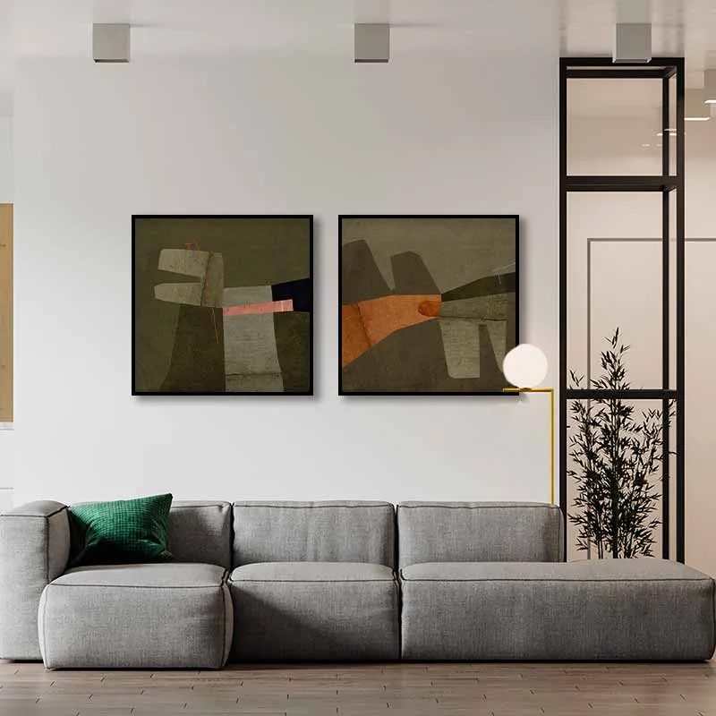 Bộ đôi tranh trừu tượng này mang đến một cảm giác ấm áp và gần gũi với bảng màu đất tự nhiên, kết hợp các sắc thái của xanh olive, nâu trầm và hồng nhạt. Các hình khối độc đáo được sắp xếp hài hòa, tạo nên một câu chuyện nghệ thuật liền mạch, mang đến sự tinh tế và phong cách cho không gian sống của bạn.