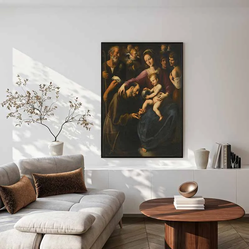 Bức tranh tái hiện khung cảnh Gia Đình Thánh với Đức Mẹ Maria ôm Chúa Hài Đồng, được Thánh Phanxicô Assisi và một số nhân vật khác vây quanh trong tư thế kính cẩn. Bức tranh toát lên sự tĩnh lặng, lòng sùng kính và tình yêu thương, với tông màu trầm ấm mang đậm phong cách hội họa cổ điển, tạo cảm giác thiêng liêng và sâu lắng.