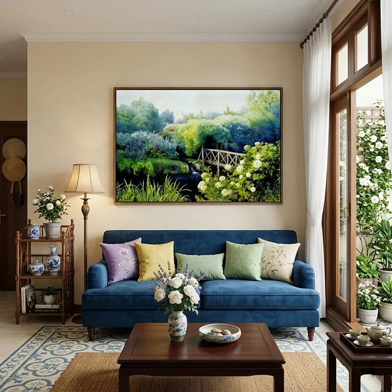 Lý do: Khung cảnh êm đềm, lãng mạn của khu vườn và dòng suối mang lại hiệu ứng an thần rất tốt. Bức tranh giúp không gian nghỉ ngơi trở nên ấm cúng, dễ chịu, đưa bạn vào giấc ngủ ngon và thư thái hơn.