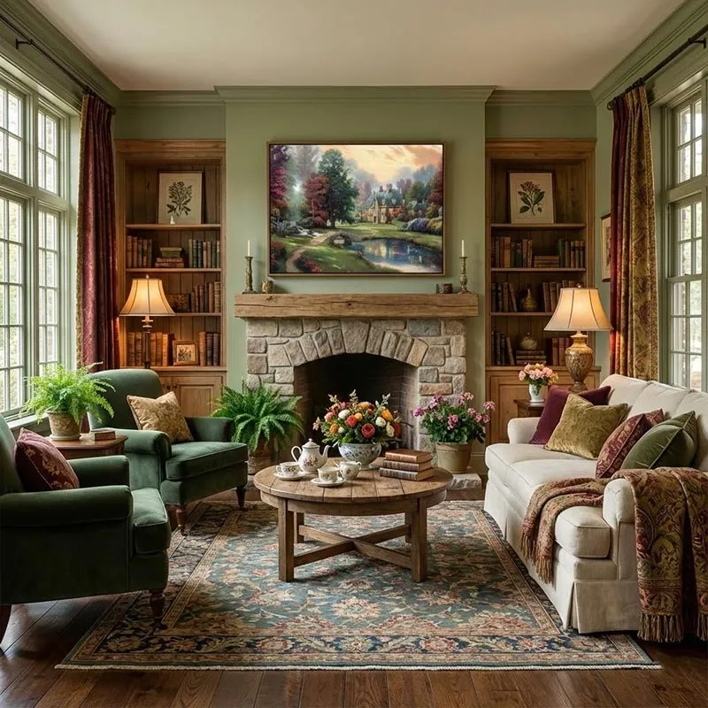 Phong cách Rustic (Đồng quê): Sự mộc mạc của ngôi nhà đá và thiên nhiên trong tranh hòa quyện tốt với nội thất gỗ tự nhiên, thô mộc.