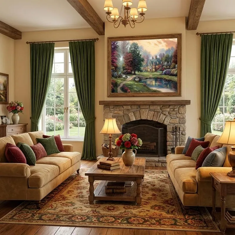 Lý do: Bức tranh có kích thước lớn, chi tiết cầu kỳ và tông màu ấm áp, sang trọng. Khi treo tại phòng khách (đặc biệt là vị trí sau ghế sofa), nó sẽ trở thành tâm điểm thu hút mọi ánh nhìn, tạo cảm giác bề thế cho gia chủ và sự hiếu khách, ấm cúng cho những vị khách ghé thăm. Khung cảnh thiên nhiên rộng lớn cũng giúp mở rộng không gian thị giác cho căn phòng.