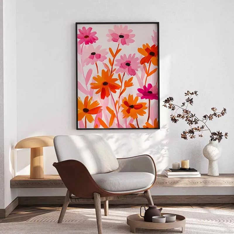 Bức tranh "Orange and Pink Flowers" với bảng màu ấm áp và họa tiết hoa lá mềm mại, là lựa chọn lý tưởng để tạo điểm nhấn dịu dàng nhưng không kém phần nổi bật cho nhiều không gian: