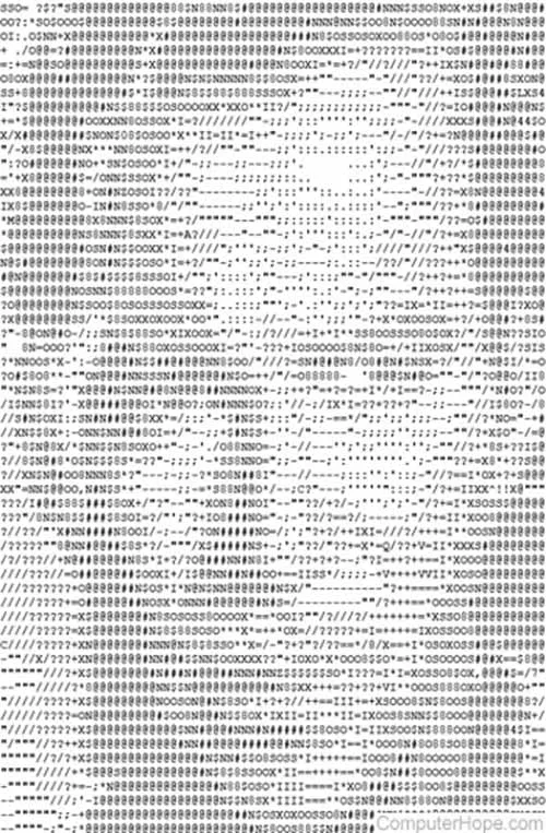 Hình ảnh hiển thị nghệ thuật ASCII sử dụng các ký tự để tạo ra hình ảnh của Thuyền trưởng Kirk từ loạt phim Star Trek gốc. Các ký tự, số và dấu câu được nghệ sĩ (hoặc thuật toán) lựa chọn dựa trên hình dạng và nội dung của ký hiệu. Ví dụ, dấu gạch chéo (/ ) có thể được sử dụng để tạo hiệu ứng đánh bóng chéo, giống như trong truyện tranh.