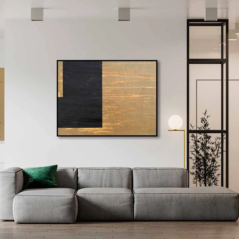 - Trên sofa: Treo tranh trên sofa màu trung tính (xám, trắng, be) sẽ làm nổi bật sự tương phản của đen và vàng kim, tạo nên một không gian hiện đại và sang trọng.