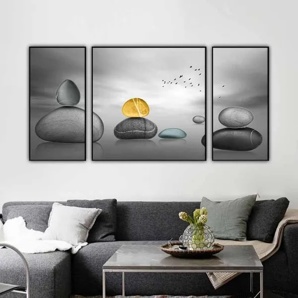Tranh bộ 3 tấm với nội dung là các tảng đá phong thủy đen và vàng