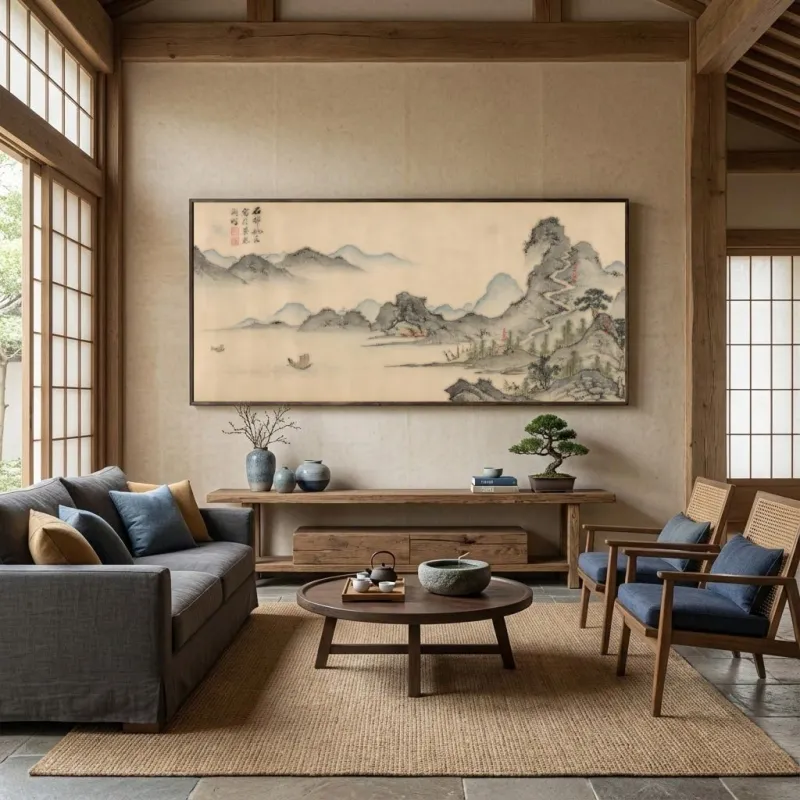 Giải thích: Sự tinh giản trong màu sắc và đường nét của thủy mặc hoàn toàn phù hợp với triết lý Tối Giản và Thiền, giúp tạo ra một không gian yên bình, sâu sắc và không bị phân tâm.