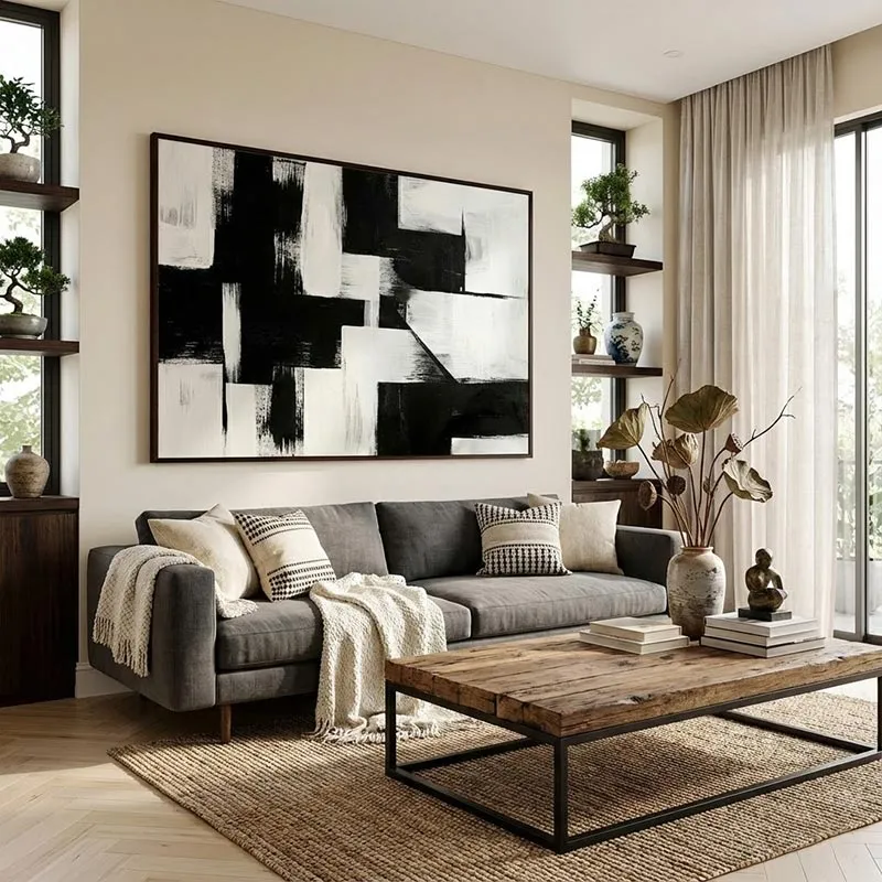 Lý do: Phòng khách là bộ mặt của ngôi nhà, và bức tranh này có đủ sức nặng để làm "Focal Point" (điểm nhấn trung tâm). Với tông màu đen trắng trung tính, nó cực kỳ dễ phối hợp với các bộ sofa màu xám, trắng, kem hoặc da bò. Bức tranh mang lại vẻ đẹp tri thức, hiện đại và giúp không gian trở nên sang trọng hơn mà không cần quá nhiều màu sắc rực rỡ.