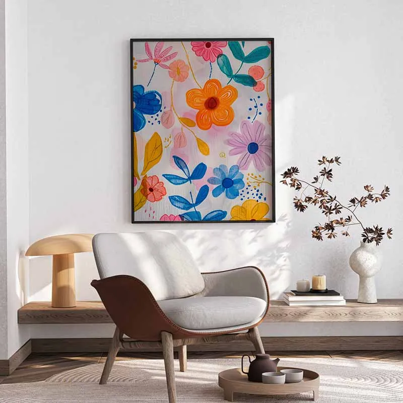 - Phòng khách hiện đại/phòng khách tối giản: Bức tranh sẽ là tâm điểm rực rỡ trên bức tường trắng hoặc trung tính, mang lại sự sống động, năng lượng và cảm giác vui tươi cho không gian. Sự tương phản giữa gam màu mạnh mẽ của hoa và nội thất đơn giản sẽ tạo nên hiệu ứng thị giác ấn tượng, thu hút mọi ánh nhìn.