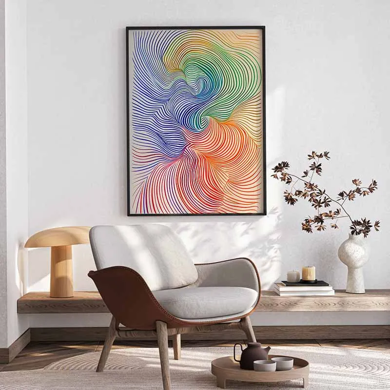 Bức tranh trừu tượng này là một tác phẩm đầy tính nghệ thuật và phức tạp, nổi bật với hàng trăm đường nét mảnh mai, uốn lượn và đan xen vào nhau, tạo nên một hiệu ứng thị giác mê hoặc. Sự chuyển đổi màu sắc tinh tế từ xanh dương, đỏ, cam đến xanh lá cây giúp tạo cảm giác về chiều sâu và chuyển động, mời gọi người xem khám phá không ngừng. Đây là một điểm nhấn hiện đại, mang đến sự tinh tế và một chút bí ẩn cho mọi không gian.