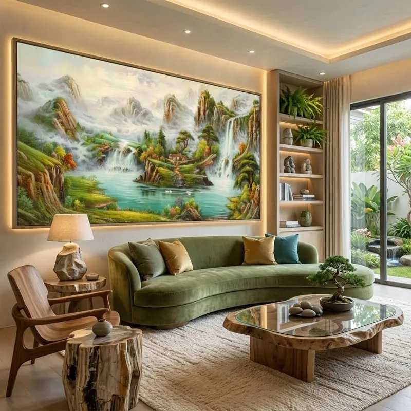 Lý do: Phong cảnh sơn thủy tạo cảm giác hài hòa, sung túc và bình an cho ngôi nhà. Bố cục nằm ngang phù hợp để treo trên ghế sofa, giúp mở rộng tầm nhìn và tăng thêm tính thẩm mỹ cho không gian tiếp khách.