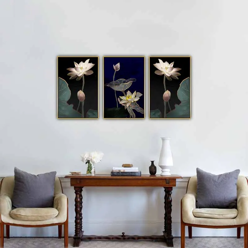 Bộ tranh ba tấm "Tinh Khôi Sen Hồngsen" mang đến vẻ đẹp thanh tao và sang trọng của hoa sen trắng nở rộ trên nền đêm huyền bí. Những đường nét vàng kim tinh tế tôn lên vẻ đẹp thuần khiết của loài hoa, tạo nên một tác phẩm nghệ thuật đầy ấn tượng và ý nghĩa cho không gian sống. Sự kết hợp hài hòa giữa màu sắc và bố cục mang đến cảm giác yên bình và thư thái, như một lời nhắc nhở về sự thanh cao và tĩnh lặng trong tâm hồn.