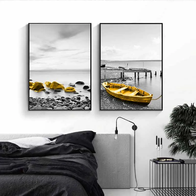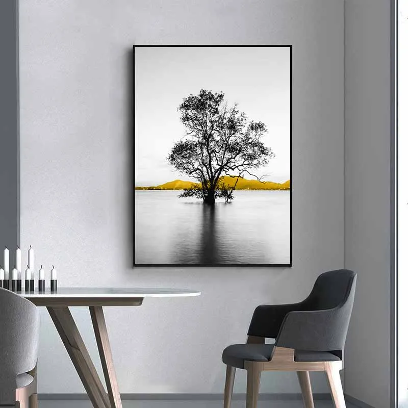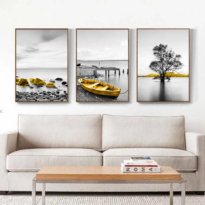 Tranh Bắc Âu phong cảnh đen trắng, tranh phong cảnh đơn giản dòng sông và con thuyền